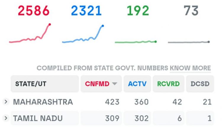 ଅନ୍ୟପଟେ କୋଭିଡ-୧୯ ଟ୍ରାକର ତଥ୍ୟ ଅନୁସାରେ, ଦେଶରେ ଆକ୍ରାନ୍ତଙ୍କ ସଂଖ୍ୟା ୨୫୬୭ ଦର୍ଶାଯାଇଛି। ସେମାନଙ୍କ ମଧ୍ୟରୁ ୨୩୦୩ ଏବେ ଚିକିତ୍ସାଧୀନ ଥିବାବେଳେ ୭୨ ଜଣଙ୍କ ମୃତ୍ୟୁ ହୋଇଛି। ସେହିପରି ୧୯୨ ଜଣ ଚିକିତ୍ସା ପରେ ସୁସ୍ଥ ହୋଇଛନ୍ତି। ଏହି ତଥ୍ୟ ଅନୁସାରେ ମହାରାଷ୍ଟ୍ରରେ ସର୍ବାଧିକ ୪୨୩ ଆକ୍ରାନ୍ତ ଥିବାବେଳେ ତାମିଲନାଡୁରେ ୩୦୯, ଦିଲ୍ଲୀରେ ୨୯୩, କେରଳରେ ୨୮୬ ଆକ୍ରାନ୍ତ ଚିହ୍ନଟ ହୋଇଛନ୍ତି। ବିଭିନ୍ନ ରାଜ୍ୟର ତଥ୍ୟକୁ ଭିତ୍ତିକରି ଏହି ତଥ୍ୟ ପ୍ରକାଶ କରାଯାଇଛି।