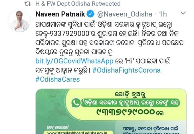 ଭୁବନେଶ୍ୱର, ୨୨।୪(ବ୍ୟୁରୋ): ରାଜ୍ୟ ସରକାରଙ୍କ ପକ୍ଷରୁ ଆରମ୍ଭ କରାଯାଇଛି ଏକ ନୂତନ ପଦକ୍ଷେପ।ହ୍ଵାଟ୍ସଆପ ଜରିଆରେ ମିଳିବ କରୋନା ତଥ୍ୟ।କରୋନା ମହାମାରୀ ମୁକାବିଲା ଲାଗି ରାଜ୍ୟ ସରକାରଙ୍କ ପକ୍ଷରୁ ବ୍ୟାପକ ପଦକ୍ଷେପ ଗ୍ରହଣ କରାଯାଉଛି। ଏହି କ୍ରମରେ ଲୋକଙ୍କ ପାଖରେ କରୋନା ସମ୍ପର୍କିତ ତଥ୍ୟ ପହଞ୍ଚାଇବାକୁ ରାଜ୍ୟ ସରକାର ଉଦ୍ୟମ କରିଛନ୍ତି। ଏ ନେଇ ଏକ ହ୍ବାଟ୍‌ସ ଆପ୍‌ ଗ୍ରୁପ୍‌ ତିଆରି କରାଯାଇଛି। ‘ଓଡ଼ିଶା ସରକାର ହ୍ବାଟ୍‌ସଆପ୍‌ ଇନ୍‌ଫୋ ଡେସ୍କ’ ନାମକ ଏହି ଗ୍ରୁପ୍‌କୁ ବୁଧବାର ଶୁଭାରମ୍ଭ କରିଛନ୍ତି ମୁଖ୍ୟମନ୍ତ୍ରୀ ନବୀନ ପଟ୍ଟନାୟକ। bit.ly/OGC Covid ହ୍ବାଟ୍‌ସ ଆପ୍‌ର ନମ୍ବର ହେଉଛି ୯୩୩୭୯୨୯୦୦୦। ହ୍ବାଟ୍‌ସ ଆପ୍‌ରେ ପ୍ରଥମେ Hl ଲେଖି ପଠାଇ ଦେଲେ ସୂଚନା ପହଞ୍ଚିଯିବ। ହେଲ୍ପ ଡେକ୍ସ ଶୁଭାରମ୍ଭ ନେଇ ମୁଖ୍ୟମନ୍ତ୍ରୀ ନବୀନ ପଟ୍ଟନାୟକ ଟୁଇଟ୍‌କରି ସୂଚନା ଦେଇଛନ୍ତି।